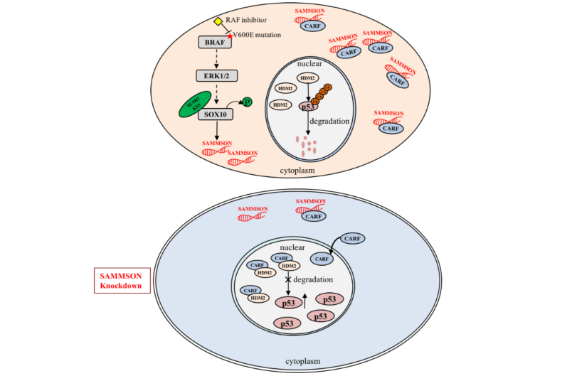 利用BRAF抑制剂威罗菲尼治疗携带BRAF基因突变的晚期黑色素瘤(Melanoma)是近年来癌症靶向治疗领域中最为成功的案例,但治疗过程中病人很快出现耐药现象,极大的限制了威罗菲尼的治疗效果和应用前景。因此研究黑色素瘤对威罗菲尼的耐药机制并以此为基础探索延缓耐药性发生的治疗手段具有重大的科学及临床意义。近日,西安交通大学生命科学与技术开元线粒体生物医学研究所刘健康教授团队和西安交通大学前沿科学技术研究院邵永平教授团队、第二附属医院郑焱教授团队紧密合作,在携带BRAF突变的黑色素瘤细胞中发现了一种新的适应性耐药因子LncRNA SAMMSON,揭示了SAMMSON/CARF/p53信号轴参与调控BRAF突变黑色素瘤细胞对RAF抑制剂的适应性耐药的新机制。