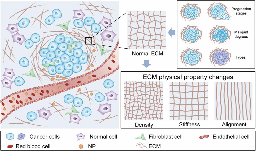 图2 临床肿瘤组织ECM的物理特征变化及其对纳米粒子扩散的影响规律