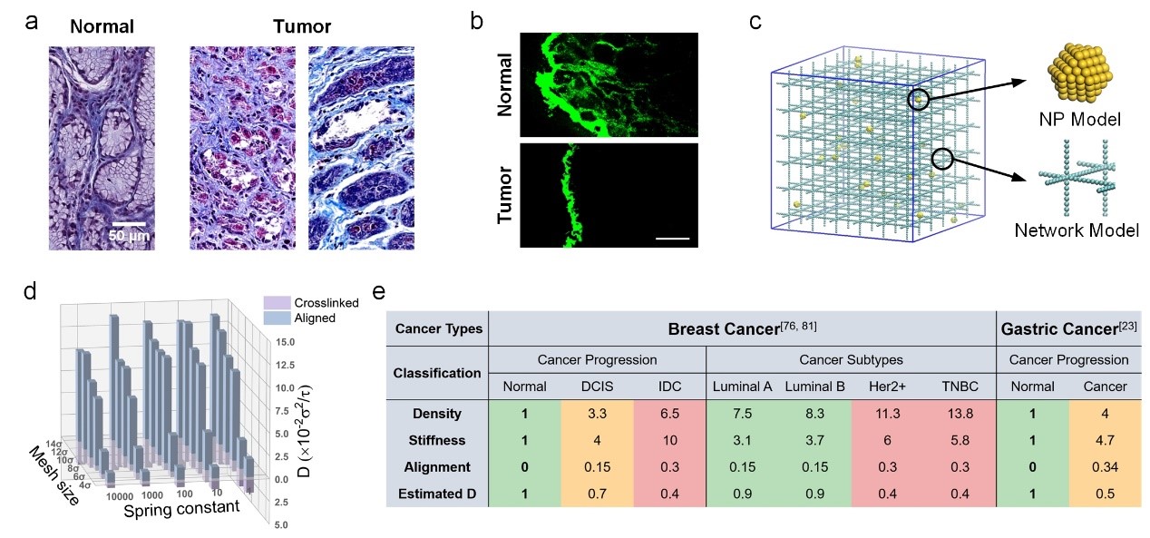 针对上述临床医学和力学学科领域交叉的共性难题,西安交通大学生命科开元与技术开元仿生工程与生物力学研究所(BEBC)依托交大“大医科+强工科”模式,充分利用交大多学科交叉和理工医融合的优势,联合本校能动开元、附属医院(二附院、红会医院、一附院)及南京航空航天大学等外校单位,通过力学、生物医学、物理、材料等多学科的交叉合作,结合临床样本统计分析、临床组织扩散实验、单粒子追踪技术、体外宏观扩散实验、分子动力学模拟及模型分析等多种研究方法和技术手段,系统研究了肿瘤ECM的密度、刚度和结构等物理和力学性质的变化对纳米粒子扩散的影响规律。
