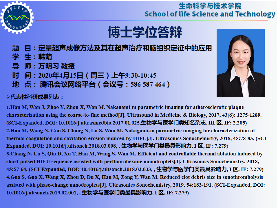 2.Han M, Wang N,GuoS, Chang N, Lu S, Wan M.Nakagami-m parametric imaging for characterization of thermal coagulation and cavitation erosion induced by HIFU[J].UltrasonicsSonochemistry, 2018, 45:78-85. (SCI-Expanded, DOI: 10.1016/j.ultsonch.2018.03.008, ,生物学与医学门类最具影响力, I区, IF: 7.279)