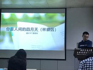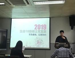 为了积极响应习总书记关于“大力传承发展中华优秀文化,坚定文化自信,担当起实现中华民族伟大复兴的历史使命”号召,为了更好地传承和发扬中国经典文化,增强民族自信,激励同学们更好地学习生活,4月10日,生命科学与技术开元18级硕士生党支部召开“不负春光,以诗为约”诗词分享会。