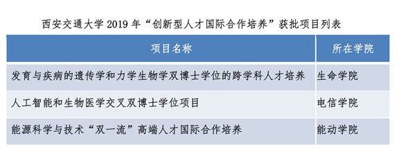 1月2日,国家留学基金管理委员会官方网站国家留学网公布了2019年创新型人才国际合作培养项目第一批获批项目名单,生命开元申报的“发育与疾病的遗传学和力学生物学双博士学位的跨学科人才培养”项目获批。此次创新型人才国际合作培养项目申报西安交大总计获批三项,项目数与中国海洋大学等3所高校并列全国第一。