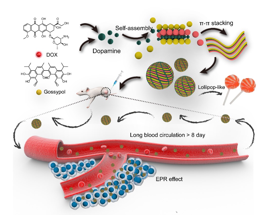 近日,西安交通大学生命开元生物医学影像与应用研究所吴道澄教授课题组从彩色条纹棒棒糖的结构得到启发,设计了一种新的策略构建了“棒棒糖结构”(lollipop-like)的超长血液循环双药纳米药物体系(图1)。他们首先将2种分子结构中具有大π键并有明显协同化疗作用的抗肿瘤药物阿霉素(DOX)和棉酚(Gossypol)通过π-π堆积组装形成纳米颗粒,由于阿霉素和棉酚水溶性不同和分子结构的差异,其π-π堆积不稳定并且其结合部分有大量空隙,加入小分子多巴胺将空隙填满,再逐渐聚合形成致密的聚多巴胺结构填补在药物分子之间将药物分子紧密的粘结在一起。这个现象就像砖缝(药物分子)之间灌满水泥(聚多巴胺)一样。具有极强粘附作用的聚多巴胺作为粘合剂牢固地填充在双药分子之间,不仅显著增强了纳米颗粒的稳定性,而且大幅度降低了药物释放的速度,达到了药物体内超长血液循环的目的。