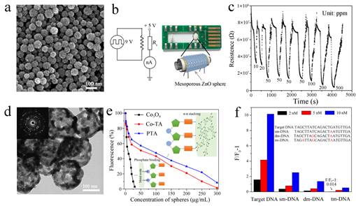 植物多酚是一种价格低廉、无毒、已实现工业化生产的天然提取物,广泛用于皮革、墨水等领域。基于植物多酚配位化学的基本原理,生命开元赵永席教授团队魏晶教授等人以不同的金属-多酚配合物为前驱物,通过控制配合物的热分解过程,得到了一系列不同组成及内部结构的介孔金属氧化物纳米颗粒(如氧化铝、氧化锌、氧化钴、氧化铁、氧化铜)。研究发现,金属会影响有机物(即植物多酚)的热分解过程,比如铝会增强有机骨架的稳定性,铁、铜、钴元素会加速有机骨架的分解。有机物的分解温度和金属氧化物的结晶温度共同影响介孔金属氧化物的内部结构(如实心或空心结构)。由于介孔金属氧化物具有规则的形貌、高比表面积及高结晶度,这种材料进一步用于构筑气体传感器,可实现酒精气体的高灵敏、高选择性检测。同时这种介孔金属氧化物材料与核酸(DNA, RNA)的磷酸基团有着强的配位作用,可有效吸附DNA探针分子。可进一步构筑介孔金属氧化物基纳米探针,实现核酸的高灵敏、高特异性检测。由于植物多酚可以和不同种类的金属离子形成配位物,这种简单的热分解方法有望用于低成本、大规模制备多种组分介孔金属氧化物,并广泛用于环境催化、清洁能源的存储与转化、气体传感及生物传感等领域。