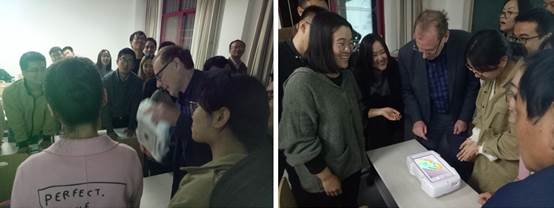 Michael G Sowa教授在报告最后展示了其团队研发成品——血管造影设备,能够对人体组织含氧量成影。Sowa教授挑选了几名在场的志愿者进行使用介绍和演示,在场师生兴趣盎然,全神贯注地观看现场演示,并提出了关于设备的使用、性能及未来改进等问题。