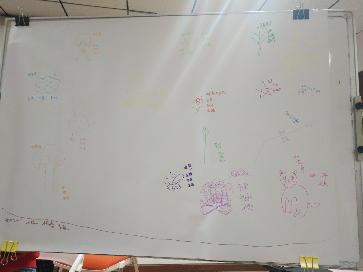 在这个环节,同学们需要想想自己是什么,可以是物品也可以是动物植物,还要写两到三个这个物品或者动植物的优点。只要是你自己认为自己是,就可以。这类活动可以让同学们直面自己的内心,看看自己在自己的心里是个什么样子。当大家陆陆续续的画完,大家还需要把纸上所有的作品进行分析,最后形成一幅自己想像中的画面。