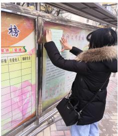 在生活小区内的宣传栏张贴海报进行宣传,并和路人进行互动宣传