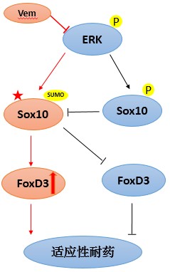 人皮肤黑色素瘤(Melanoma)是一种恶性程度相当高的黑色素细胞肿瘤,晚期死亡率高。大约50%的黑色素瘤病人携带BRAFV600E突变,针对该突变研发的RAF小分子抑制剂已在临床上获得了良好的治疗效果。但许多肿瘤病人在治疗初期即对RAF 抑制剂呈现出适应性耐药现象。以往研究发现RAF 抑制剂能通过阻断肿瘤细胞内的ERK 信号来迅速诱导ERBB3 受体分子的转录表达,而ERBB3的表达提升会进而激活其下游的PI3K/AKT 抗凋亡信号通路,引起肿瘤对RAF 抑制剂的适应性耐受。 然而ERK 信号是如何调控ERBB3 表达的这一关键问题尚未得到解答。本研究发现在BRAF突变的黑色素瘤中,ERK激酶可以通过磷酸化转录因子SOX10来干扰其SUMO化修饰,进而抑制其转录活性,并通过SOX10/FOXD3/ERBB3信号转导途径来调控ERBB3蛋白的表达水平,进一步影响肿瘤对RAF抑制剂的适应性耐药。此外,研究人员通过体内外的实验发现降低SOX10的表达水平能显著增加黑色素瘤细胞对RAF抑制剂的敏感性。