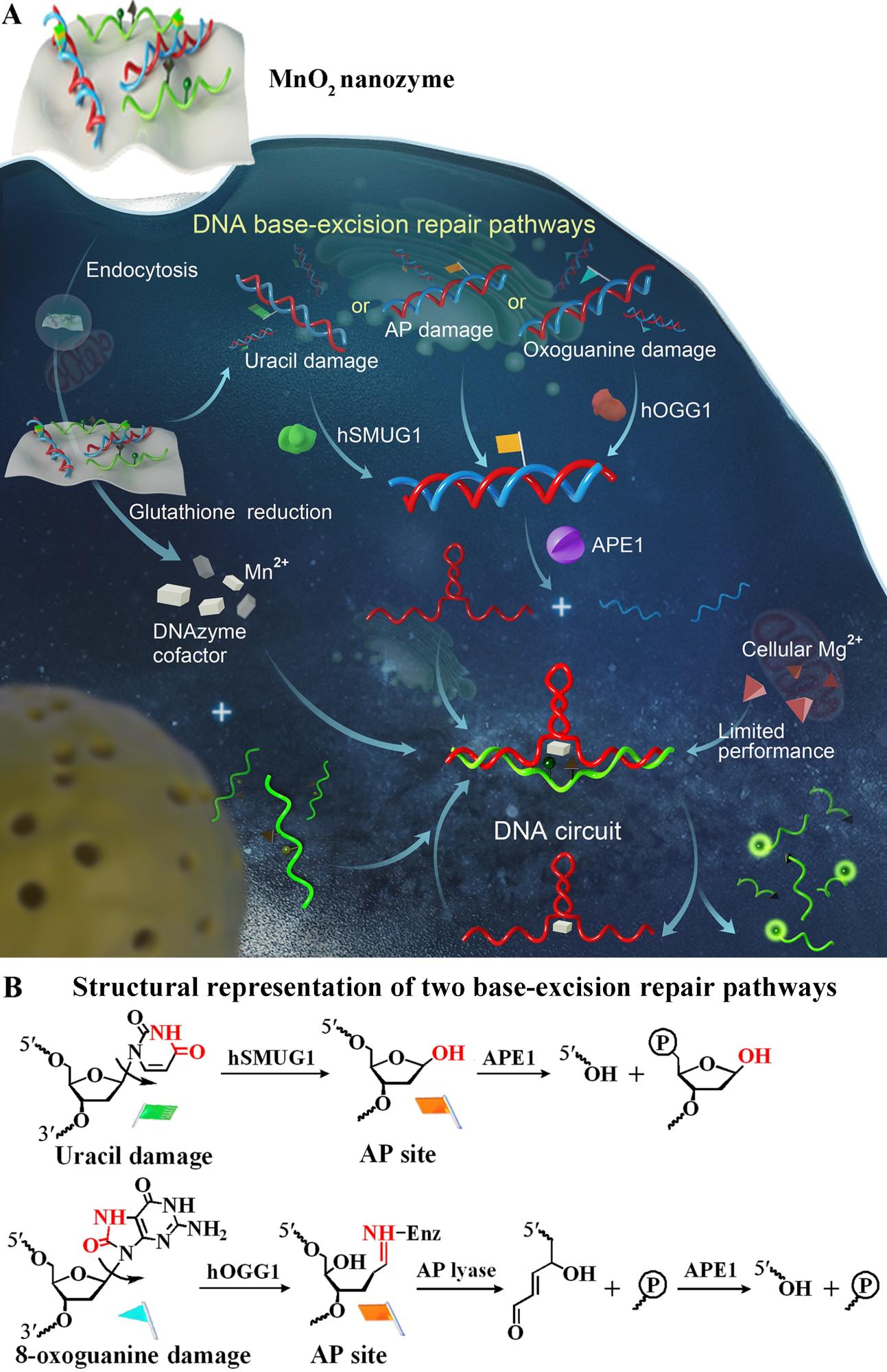 近日,针对上述挑战,西安交通大学生命开元赵永席教授研究团队设计并制备了一种MnO2 nanosheet/DNAzyme(nanozyme)系统,提高DNAzyme组装效率和催化活性,实现胞内DNA回路反应与信号放大。该MnO2 nanozyme由单层MnO2纳米片吸附多种DNA模块而形成,易于进入细胞。胞内的还原物质如谷胱甘肽可将MnO2纳米片还原成Mn2+,而Mn2+作为DNAzyme cofactor促进有序组装、构象折叠,并显著提升催化活性。目标修复蛋白识别并酶切相应的损伤DNA模块,启动组装与催化反应,最终形成DNA回路,放大荧光信号,提高肿瘤细胞低丰度修复蛋白的分析灵敏度。设计并使用可识别不同损伤的DNA模块,制备多功能的MnO2 nanozyme,可用于监测其他修复蛋白与通路。相比于MnO2 nanozyme,传统DNAzyme系统胞内组装效率低、催化活性不足,不能引起明显的细胞成像信号。