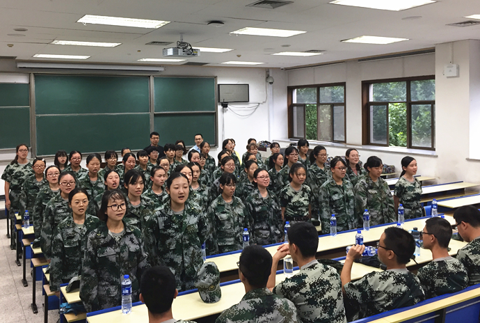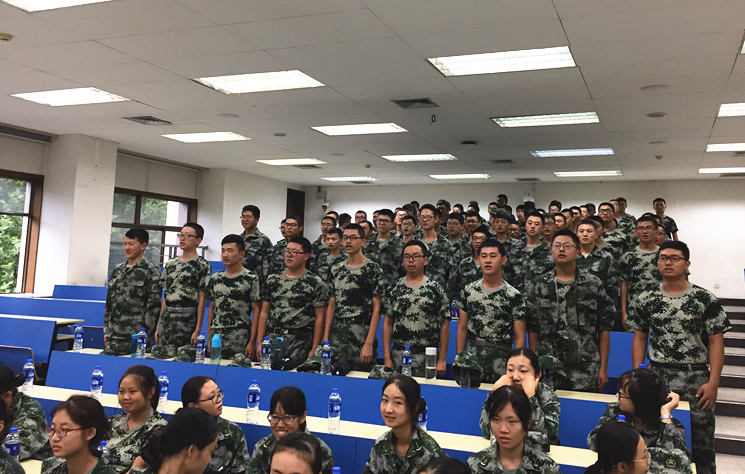 参训学生统一着迷彩服在教室内就坐,整齐的坐姿,昂扬的精神,展现出了我院新一届学生的青春风貌。刘健康院长首先表达了开元对他们的关怀和殷切希望,他通过讲述自己对军队的向往和对军人的敬佩,强调军训的重要性。他指出,短短两周的军训是四年本科刻苦学习的开始,希望同学们学习军人吃苦耐劳、保家卫国的精神, 斗志昂扬、威武挺拔的气质, 积极争取,奋勇争先,刻苦学习,团结互助,德才兼备,展现交大学子的风采,成为一名真正的交大人。