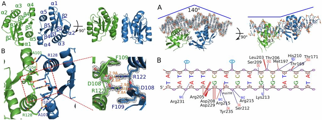 病原菌因多重耐药引起的感染已经成为威胁人类健康的全球性公共安全问题。而鲍曼不动杆菌(Acinetobacter Baumannii)被2017年度世界卫生组织WHO列为危险程度最高的多重耐药的“超级细菌”首位。鲍曼不动杆菌可导致严重的肺炎,脑膜炎,血流感染和泌尿道感染。鲍曼不动杆菌极易获得对大多数广谱类抗生素的抗性,使得其感染极难被治愈。而其抗生素抵抗的形成和它能通过AdeABC运输泵通过主动运输的方式将抗生素排出密切相关,AdeABC药物运输泵已经确认与鲍曼不动杆菌对氨基糖苷类、四环素类、氟喹诺酮类、氯霉素、红霉素、甲氧苄氨嘧啶和替加环素的抗性密切相关。该项研究工作采用一体化结构生物学方案,揭示响应调控因子AdeR可以通过识别其与AdeABC之间的一段顺反子DNA序列而调控AdeABC运输泵的表达水平。报道了AdeR调控结构域 1.4埃(Ångstrom,1埃=10-10米),AdeR调控结构域与金属镁离子复合物1.6埃以及AdeR DNA结合区域与其靶向的25bp的顺反子DNA的复合物2.75埃晶体结构,并且通过小角度X射线散射实验验证了它们在生理条件下的组装状态,系统性的阐明了直接调控AdeABC药物运输泵的响应调控因子AdeR的调控分子机制。为寻找治疗多重耐药鲍曼不动杆菌的新策略以及新的抗生素研发提供依据。