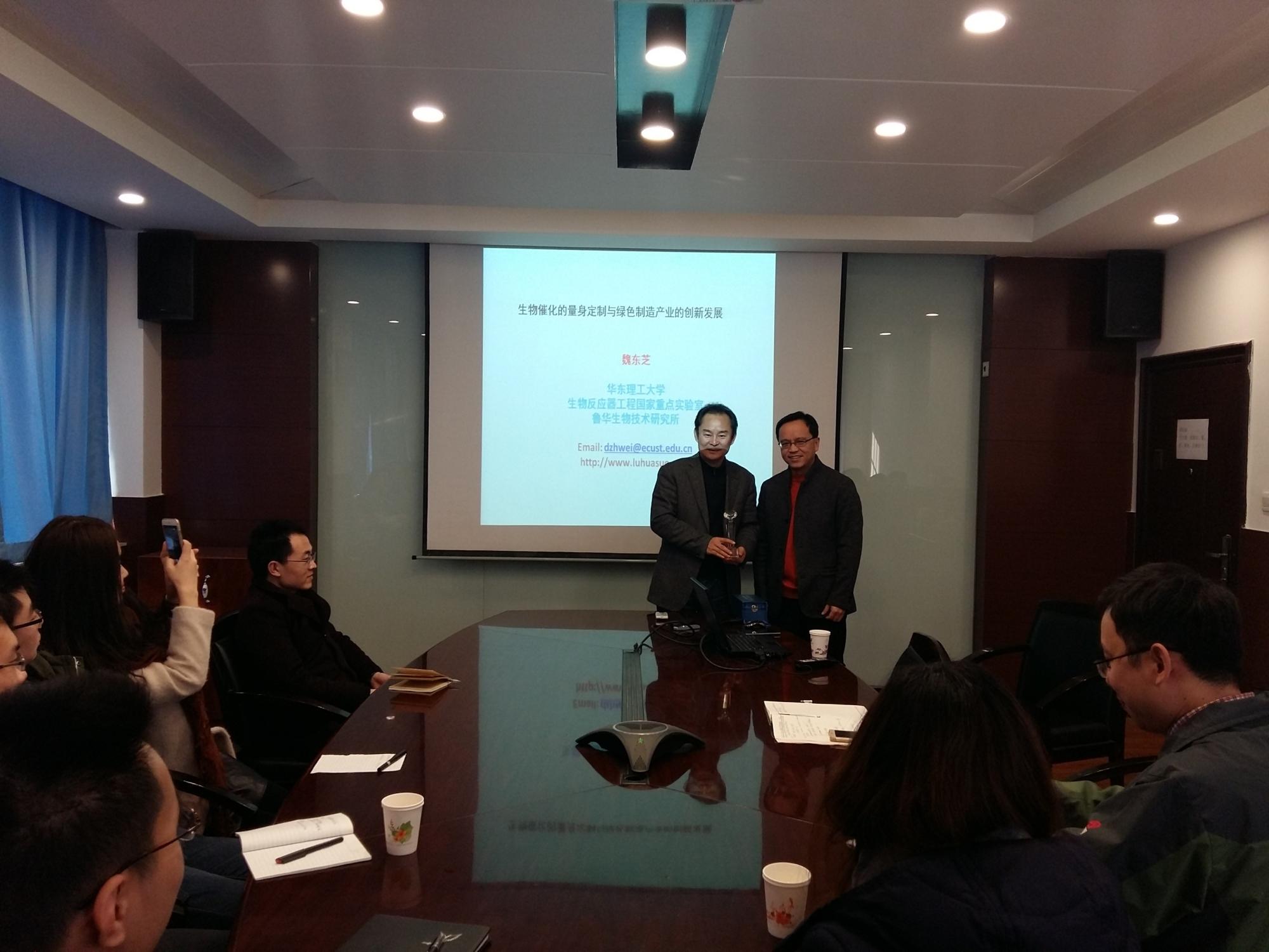 魏教授在此次报告中介绍了生物制造是替代化石燃料的新兴生产方式,而生物制造的核心是对催化生化反应的酶的认识、利用及量身定制。魏教授课题组根据国家重大技术和市场需求,运用生物工程技术、计算生物学、虚拟筛选、靶向定制等方法,在国际上建立了规模最大、技术领先的工程化酶平台,并在包括制药、印染等多个生物催化方向取得卓越成就。如在腈水解酶化学合成光学纯酰胺新路径的定制和多元醇衍生物、甾体药物的生物制造等方面,魏教授不仅解决了生物反应器的若干重大科学问题,并攻关取得自主知识产权的药物制造核心技术,多项核心技术的应用转化为我国鲁南制药等企业提供了关键支撑,显著提升了我国在生物工程领域的科技水平和国际竞争力。报告结束后,魏教授就科研合作、资源共享等问题与我院师生进行了热烈讨论并达成初步合作意向。