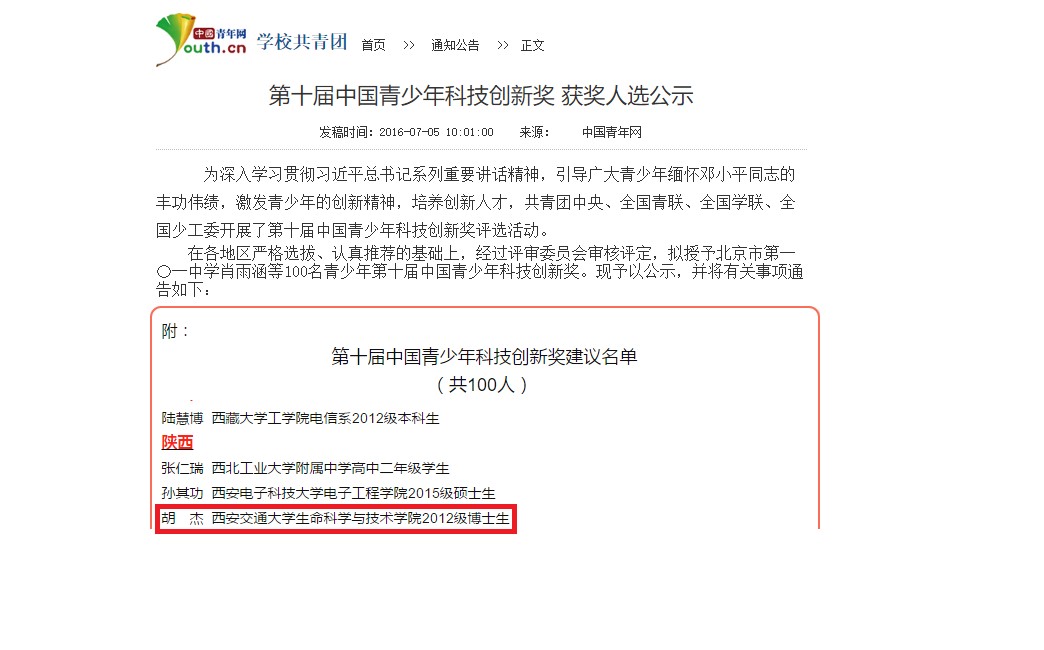近日,中国共青团中央公布了第十届中国青少年科技创新奖的获奖名单,我院在读博士生胡杰同学获得了此项荣誉,他也是此次获奖名单中仅有的十位博士生之一。中国青少年科技创新奖是为深入学习贯彻习近平总书记系列重要讲话精神,引导广大青少年缅怀邓小平同志的丰功伟绩,激发青少年的创新精神,培养创新人才,由共青团中央、全国青联、全国学联、全国少工委开展的评选活动。