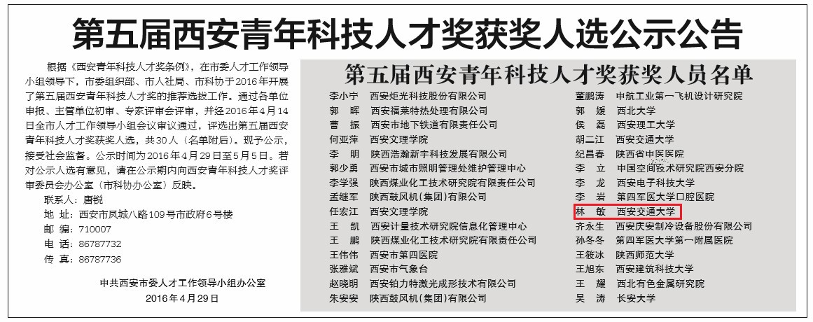近日,中共西安市市委组织部、西安市人力资源和社会保障局、西安市科学技术协会公布了第五届西安青年科技人才奖获奖名单,生命开元青年教师林敏博士获得了此项荣誉。