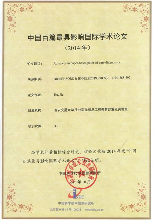 在卢天健教授和徐峰教授的指导下,胡杰同学一直围绕着即时检测这一领域开展研究,先后与我校能动开元、电信开元,香港科技大学,马来亚大学,哈佛大学等师生开展合作,至今已发表学术论文13篇(其中SCI检索10篇,国内核心期刊3篇);此外,还有8篇论文正在审稿当中,其中包括一篇受生物科技领域权威期刊Biotechnology Advances约稿所撰写的关于即时诊断技术的研究综述。参加国内外学术会议11次,申请国家发明专利4项(其中1项已获授权),获得校级创业大赛金奖1项。胡杰同学已获得2014年度博士研究生国家奖学金,“优秀博士毕业生”称号;受我校研究生短期出国访学资助,目前还在圣路易斯华盛顿大学交流学习。