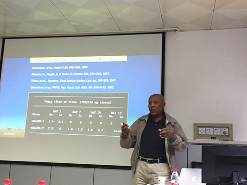 Tilahun Yilma教授的研究采用重组DNA技术研制重组疫苗和快速诊断试剂盒。Tilahun Yilma教授开发出了多种有效、安全的牛痘病毒重组疫苗,包括牛瘟、小反刍兽疫(PPR)、和裂谷热(Rift valley fever)等,并在亚洲和非洲等发展中国家得到广泛应用,显著改善了当地人畜健康。Tilahun Yilma教授不仅介绍了研究团队在疫苗开发利用方面的创新性贡献,并探讨了如何以科研成果造福亚非发展中国家、促进发展中国家科研进步方面的深入思考。Tilahun Yilma教授的报告让在座师生深切的感受到,科研不仅仅是高水平研究,更重要的是如何以高水平的科研成果真正造福大众。