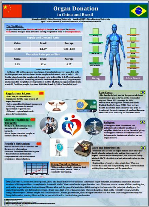 在此次学习中,她们表现非常突出,不仅在课程学习上收获了新的知识,考试也取得了优异的成绩,在课后的学习生活中,亦能积极参与学校组织的各项活动,建立了与各国老师和同学之间的友好关系。恭喜她们在此次活动中有所收获,也愿她们能在今后的学习生活中能取得更好的成绩!下图为两位同学在生物医学工程暑期学习班的海报设计项目中与巴西同学合作完成的以器官捐赠为主题的展板。
