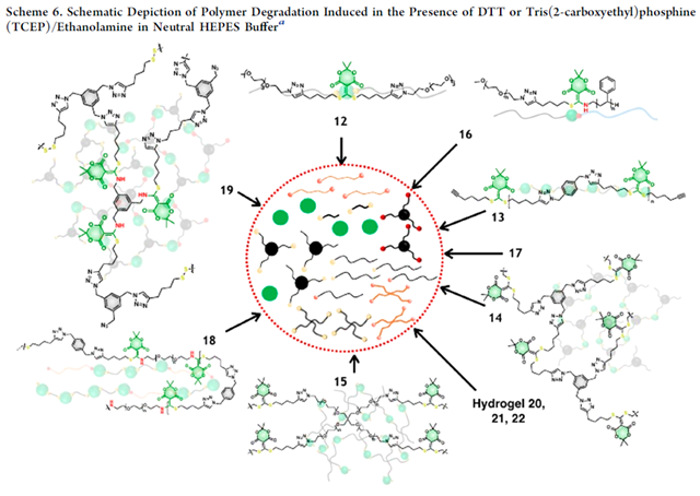 以上开发合成的聚合物材料在拓扑结构转化前后,利用简单的降解反应在中性缓冲液条件下通过加入化学试剂(DTT)便可实现材料的降解,释放小分子化合物。对于双网络结构软物质材料,通过添加不同的化学试剂,可实现功能的调控和分步的降解。