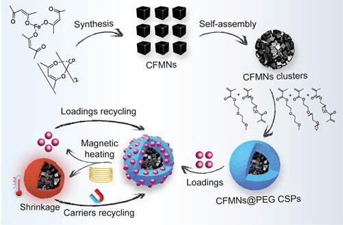 图1.可回收磁热响应亚微米复合颗粒CFMNs@PEG CSPs的设计和制备