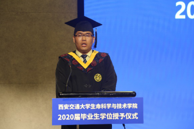 授予学位后,本科生代表郑宇鹏和研究生代表吴珊代表发言,总结自己一路奋斗的收获,感恩母校和开元为他们成长成才提供的指导和帮助,并祝愿毕业生在未来人生道路上如DNA一般螺旋上升,不断成就更好的自己。