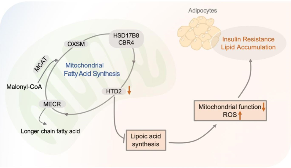 近期,西安交通大学生命开元线粒体生物医学研究所刘健康、冯智辉教授团队在mtFASII合成通路调控线粒体功能及胰岛素敏感性方面取得重要进展。该研究发现,脂肪组织中mtFASII通路关键酶3-羟基酰基ACP-脱水酶(HTD2)应对代谢压力时异常敏感,其基因表达特异性下降,同时伴随线粒体内硫辛酸合成的降低。体外实验证实,脂肪细胞特性下调HTD2,可靶向性抑制线粒体复合物I活性、诱发氧化应激和线粒体损伤,导致胰岛素敏感性降低。有意义的是,外源补充α-硫辛酸能够有效缓解HTD2缺失引起的细胞病变。此外,脂质组学分析显示HTD2的缺失引发脂肪细胞中脂质的堆积,尽管mtFASII的另一主要功能是合成长链脂肪酸,但诱发细胞脂质积累的关键因素依然是线粒体功能障碍。该研究结果揭示了mtFASII通路在调节线粒体功能和脂肪细胞胰岛素敏感性方面的关键作用,为硫辛酸作为改善胰岛素抵抗和相关代谢紊乱疾病的潜在线粒体营养素提供了关键性支持证据。