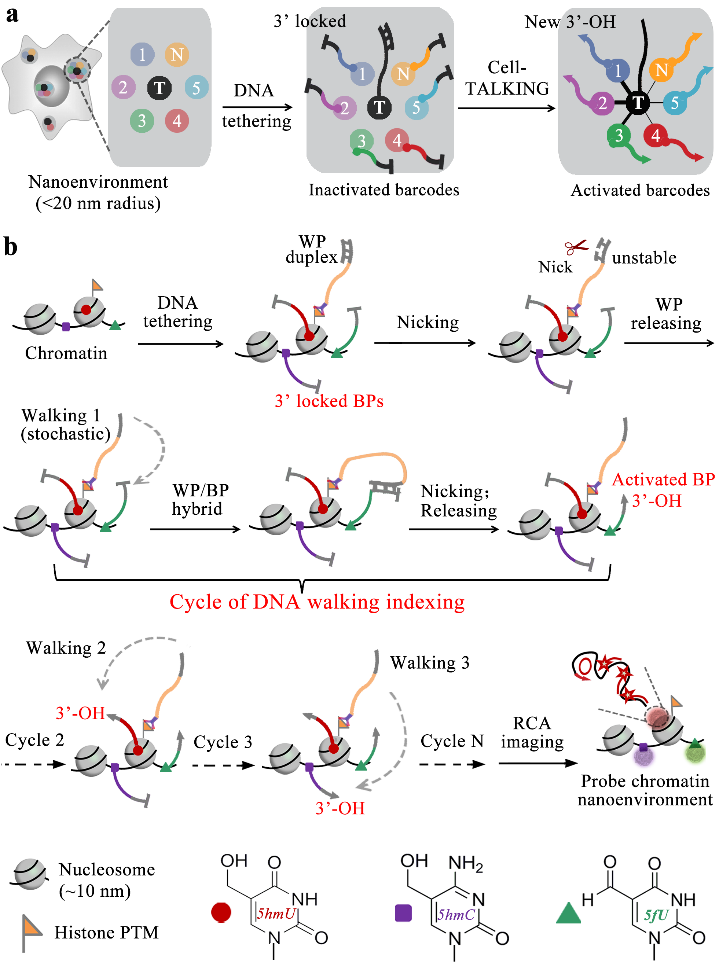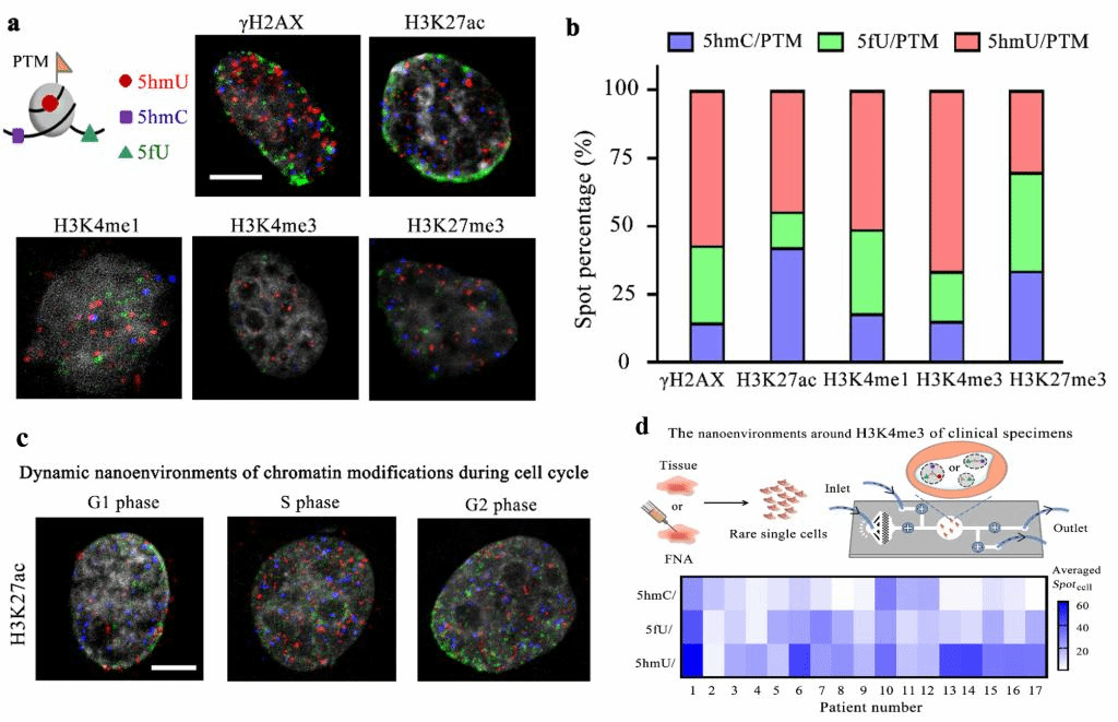 单细胞内生物大分子及其复合物在空间上存在复杂、多样的组成关系。染色质作为重要的大分子复合物,以约10 nm的核小体为基本单元,由核酸物质(DNA、RNA)与各种蛋白质组成,且存在大量DNA表观修饰和组蛋白翻译后修饰(Post-translational modification, PTM)。纳米空间内(如半径10 nm范围)复杂的染色质组成(定义为染色质纳米环境),可能在细胞生命过程中扮演着多种角色,参与多路反应,发挥重要的调控作用。因此,探究染色质纳米环境,对于理解染色质复杂组成、构象及调控机制等具有重要意义,但当前仍缺乏有效的识别检测方法。