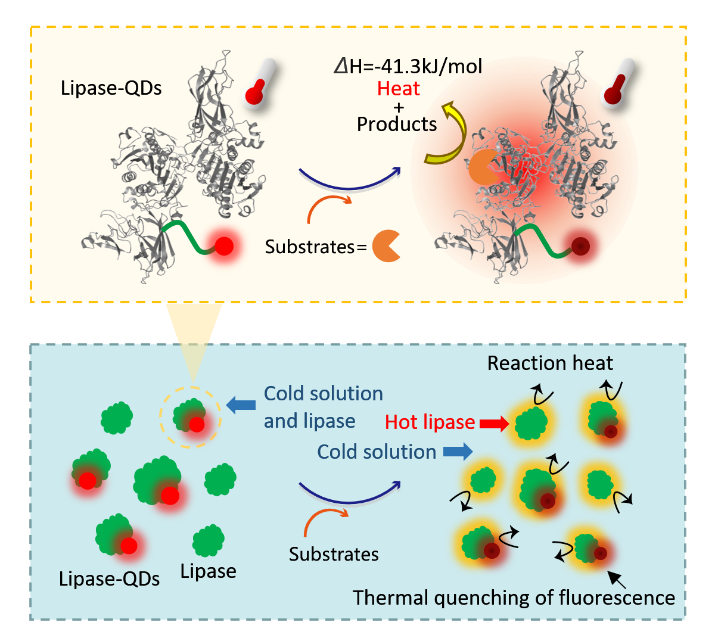 近日,西安交通大学生命开元生物医学影像与应用研究所吴道澄教授课题组提出了一种可以在微纳米尺度下准确、实时监测酶促反应中放热情况的新方法(图1)。文中合成了一种表面带有大量氨基的AgInS2量子点,该量子点的荧光强度具有显著的温度依赖,荧光强度接近线性地随温度升高而降低,灵敏度为-2.82%°C-1。通过化学交联将量子点紧密地接枝到被测物脂肪酶上,确保量子点检测的是酶周围的温度而不是溶液温度。在交联了量子点的脂肪酶溶液中加入底物,利用荧光分光光度计实时地检测溶液荧光变化,发现随着底物加入溶液荧光强度迅速减弱,经换算最大温差超过溶液6°C,直到底物消耗完才回复到初始值。该方法具有良好的重现性,最大误差约为4%,温度分辨率约为0.5°C,可以检测低至0.02 mg/mL的酶溶液。该体系的荧光信号直接代表了酶周围纳米尺度微区域的温度变化,实现了对酶促反应中的非平衡放热检测。这种酶周围热量分布的不均匀性对于研究纳米尺度生物体内的热行为和生物特性具有重要意义。该方法对于研究生物体内各种与热有关的酶过程、线粒体内的热释放、甚至肿瘤热疗中的温度反馈都有重要参考价值。