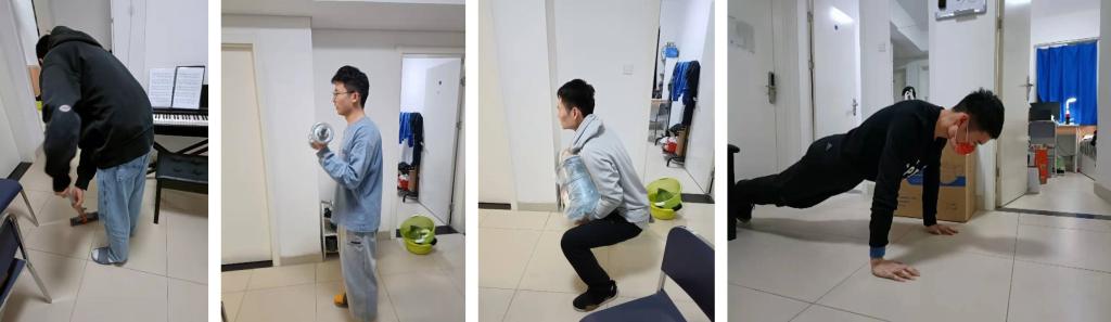 下午16:30,盯了一天屏幕的同学们已经有些疲惫,同学们脑洞大开,开展“花式”运动,增强身体素质。任泽华同学表示:“扫扫地,拖拖地,洗洗衣服,找找居家的跟练视频做一些徒手的训练,开动头脑,宿舍的物件都可以当作健身器械。”