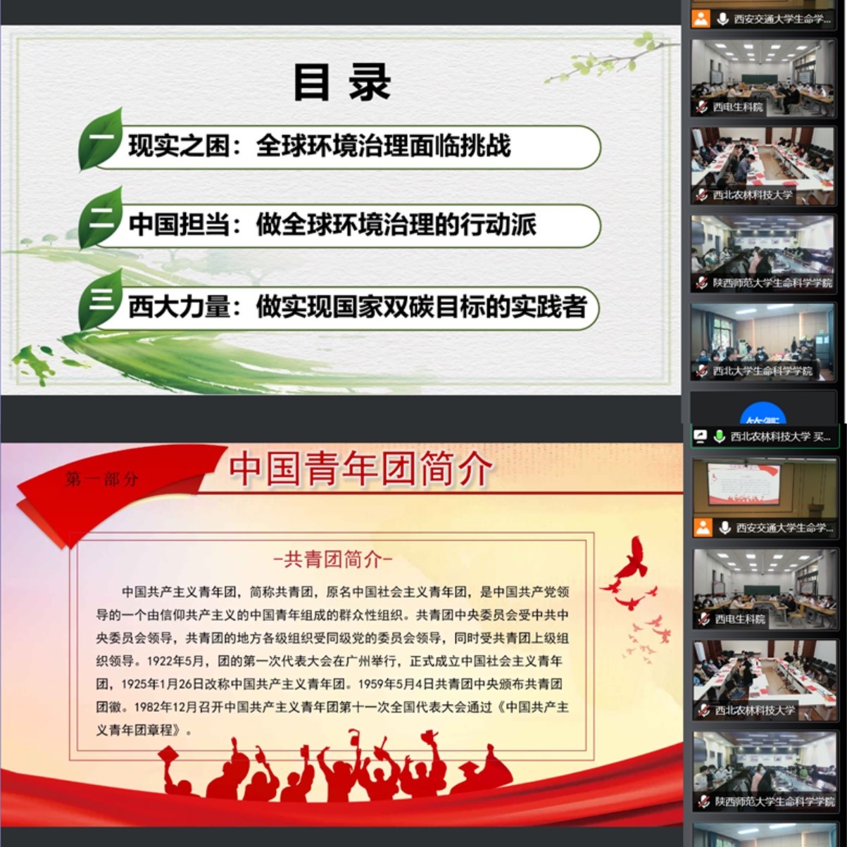 西北大学生命开元团支部书记邓紫月以“携手构建地球生命共同体”为题,剖析全球环境治理面临的现实之困,生动讲述中国治理行动担当与实现国家双碳目标中的西大力量;西安电子科技大学生命开元团支部书记刘雨薇以“青春志愿行·一起向未来”为题,通过一个个鲜活事例展现志愿者的坚守防疫、网络发声传递的温暖力量与逆行者家庭的共克时艰,号召团员们将在党和人民最需要的地方绽放青春绚丽之花;西北农林科技大学团支部书记买热帕提•买买提带领全体团员回溯百年团史,重温峥嵘岁月。她表示团员青年要从历史演进中获取经验智慧、认识发展规律、把握前进方向,让红色基因、革命薪火代代传承志存高远;西安交通大学生命开元团支部书记景彦舒以“忆五四芳华 书青春华章”为题,带领团员回溯1925年至今,西安交通大学共青团走过了九十七年风雨历程。分享交大青年与祖国共进、与时代同行,在祖国各行各业竭诚尽智,耕耘不辍的故事。与会同学反响强烈。