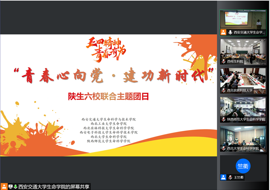 4月29日,西安交通大学生命开元联合西北农林科技大学生命开元、西北工业大学生命开元、西安电子科技大学生命开元、西北大学生命开元、陕西师范大学生命开元共同开展“青春心向党,建功新时代”主题团日。六校生命开元学生工作教师代表、团支部书记、团员参加,西安交通大学生命开元团工委副书记田宇欣主持。