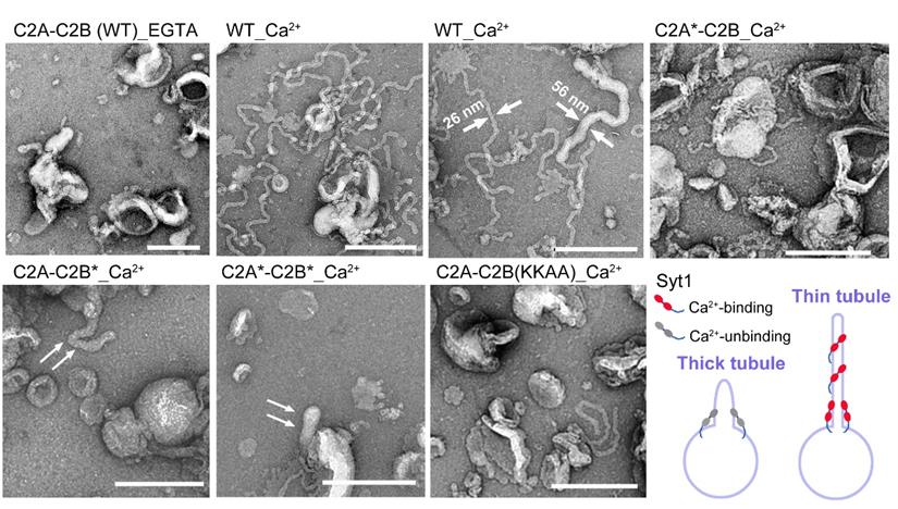 研究人员通过体外脂质体形变实验还发现,Syt1可Ca2+依赖性地促进脂质体生成脂质小管,但存在粗、细两种不同的脂质体小管(图3),而在无Ca2+条件下、或去除C2B结合Ca2+能力的突变体则只能促使脂质体产生粗管,而不能产生细管,表明Syt蛋白可介导脂质体发生两阶段的“弯曲形变”,而C2B结构域与Ca2+的结合是Syt1促进粗管向细管转变的关键所在,可能是促进巨胞吞模式向CME转变的分子基础。