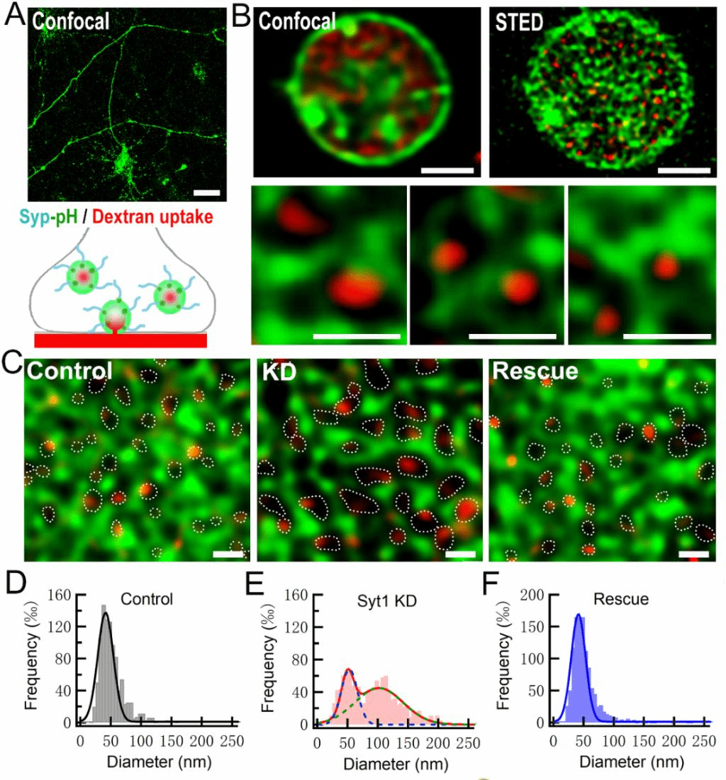为进一步研究Syt1对不同胞吞模式的调控作用,研究人员在神经元中表达Syp-pH来标记突触囊泡(含分泌囊泡与内吞囊泡),通过dextran uptake标记内吞囊泡,采用超高分辨(40 nm分辨率)STED成像观察内吞囊泡的大小和数量(图2),发现Syt1可促进直径较小的慢速相胞吞过程(CME)而抑制大直径的快速相胞吞(巨胞吞)过程。同时,采用Syt1不同突变体对KD神经元的挽救实验表明,Syt1 C2A和C2B结构域均可Ca2+依赖性地促进CME过程,但Syt1对巨胞吞的抑制作用严格依赖于C2B结构域与Ca2+的结合。