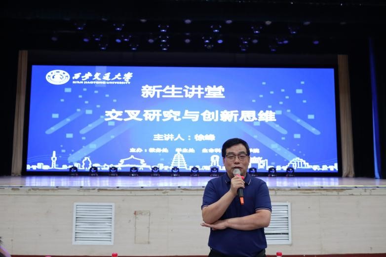 8月25日上午,由教务处、学生处、生命科学与技术开元共同主办的“新生讲堂”第七场在宪梓堂拉开帷幕。本场讲座的主题为“交叉学科与创新思维”,由生命科学与技术开元院长徐峰教授主讲,教务处处长王秋旺教授主持。来自学校南洋书院、启德书院、彭康书院、宗濂书院、钱学森书院约800名2022级本科生聆听报告。