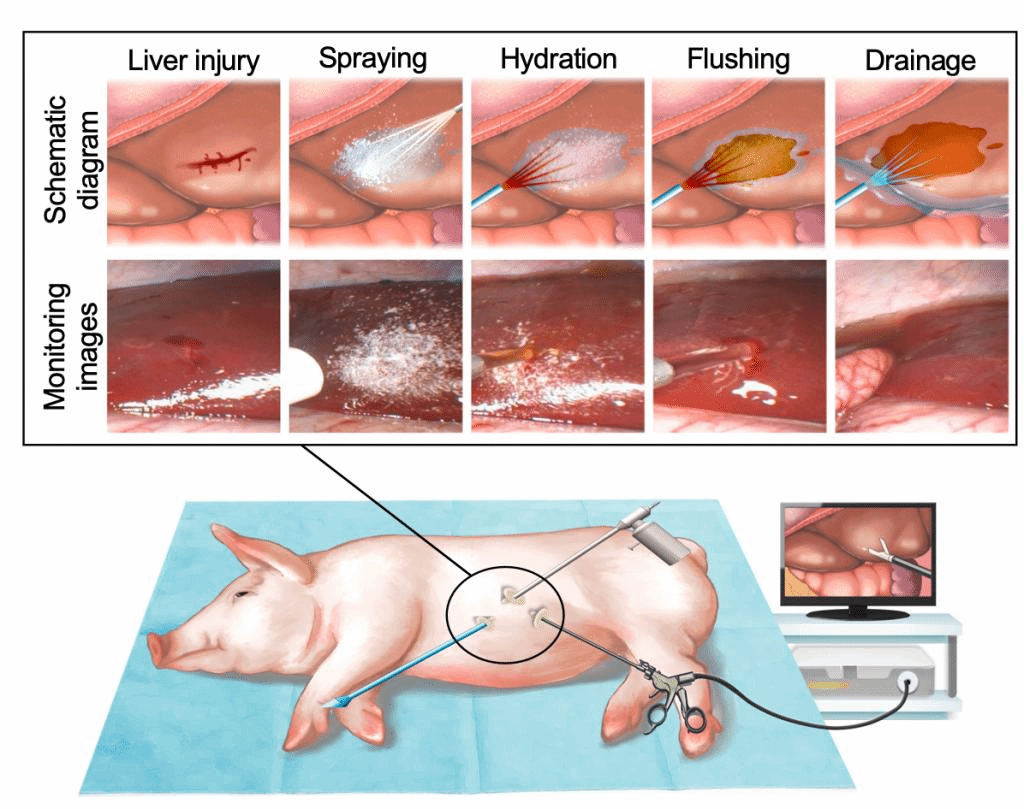 图2:FJG粉末在内窥镜辅助下的微创手术中递送的标准流程示意图及临床前猪的手术演示图像