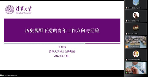 清华大学博士生讲师团王叶伟博士首先为六校青年做了《历史视野下党的青年工作方向与经验》的主题报告。王叶伟基于历史脉络,深入分析党在不同时期青年工作的探索,并带领各校师生回顾党的十八大以来习近平总书记对青年的殷切寄语,和全方位加强党对青年工作的具体指示。