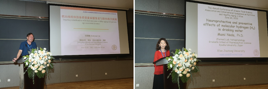 柴渭副校长、王云岗处长、王晶副部长、刘健康教授、林晓平秘书长、杨兴斌理事长共同切糕,正式启动本次大会。刘健康教授担任本届年会学术委员会主任,刘健康教授以“靶向线粒体的食养要素改善代谢性疾病”为题、Mami Noda教授以“Neuroprotective and preventive effects of molecular hydrogen (H2) in drinking water(富氢水的神经保护作用)”为题、杨兴斌理事长以“茯茶冠突散囊菌及其胞外多糖调控脂肪产热的营养机制”为题作了大会报告,分享了他们的最新研究。李巨秀教授,曹炜教授,贾玮教授,曹万新研究员、张雅利教授、李卫敏教授、唐德剑主任、王云阳教授、王京臣记者分别聚焦前沿科技、产业经济、国家多元化高值化食物资源和人民生命健康等角度作大会报告。梁冰、李红波、李婷、卜贤盼、耿敬章、牛鹏飞等6位的青年学者报告为健康机理研究、产品技术、功能开发提供了新思路。