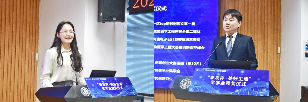 医电2103 班樊易美同学、硕2122班梁团结同学分别代表本科生、研究生获奖学生发言。樊易美对泰发祥集团表达了诚挚的谢意,并表示将永葆对未知领域的好奇心和探索欲,在祖国医疗器械领域笃学深耕,把青春绽放在人民生命健康事业上。梁团结表示,未来将不负时代重托,脚踏实地、志存高远,为守护人民生命健康,成就幸福美好生活贡献自己的力量。