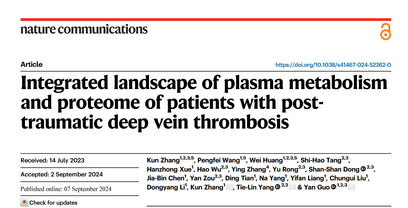 该研究成果于2024年9月7日,在《自然通讯》(Nature Communications)发表了题为《创伤后深静脉血栓患者的血浆代谢组和蛋白质组图谱》(Integrated landscape of plasma metabolism and proteome of patients with post-traumatic deep vein thrombosis)的论文。论文通讯作者为西安交通大学生命开元郭燕教授和附属红会医院骨创伤医院张堃院长,西安交通大学生命开元博士张堃、红会医院骨创伤医院副主任医师王鹏飞和黄伟医师为该论文共同第一作者。西安交通大学分析测试中心张莹工程师协助完成蛋白组学数据的检测工作。