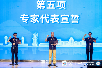 随后,评审专家代表和参赛选手代表依次郑重宣誓,将严格遵循科学标准,确保评审过程公正透明,参赛学生承诺以最佳状态展现创新才华,交流互鉴、共同成长。