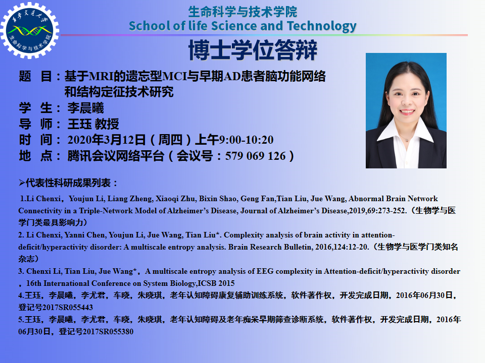 1.LiChenxi,YoujunLi, Liang Zheng,XiaoqiZhu,BixinShao,GengFan,TianLiu,JueWang, Abnormal Brain Network Connectivity in a Triple-Network Model of Alzheimer’s Disease, Journal of Alzheimer’s Disease,2019,69:273-252.(生物学与医学门类最具影响力)