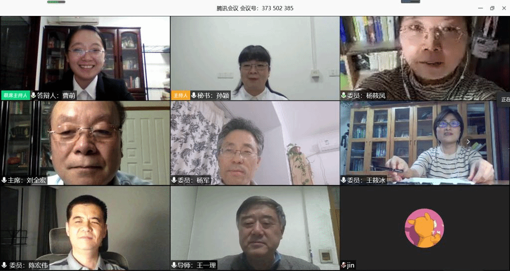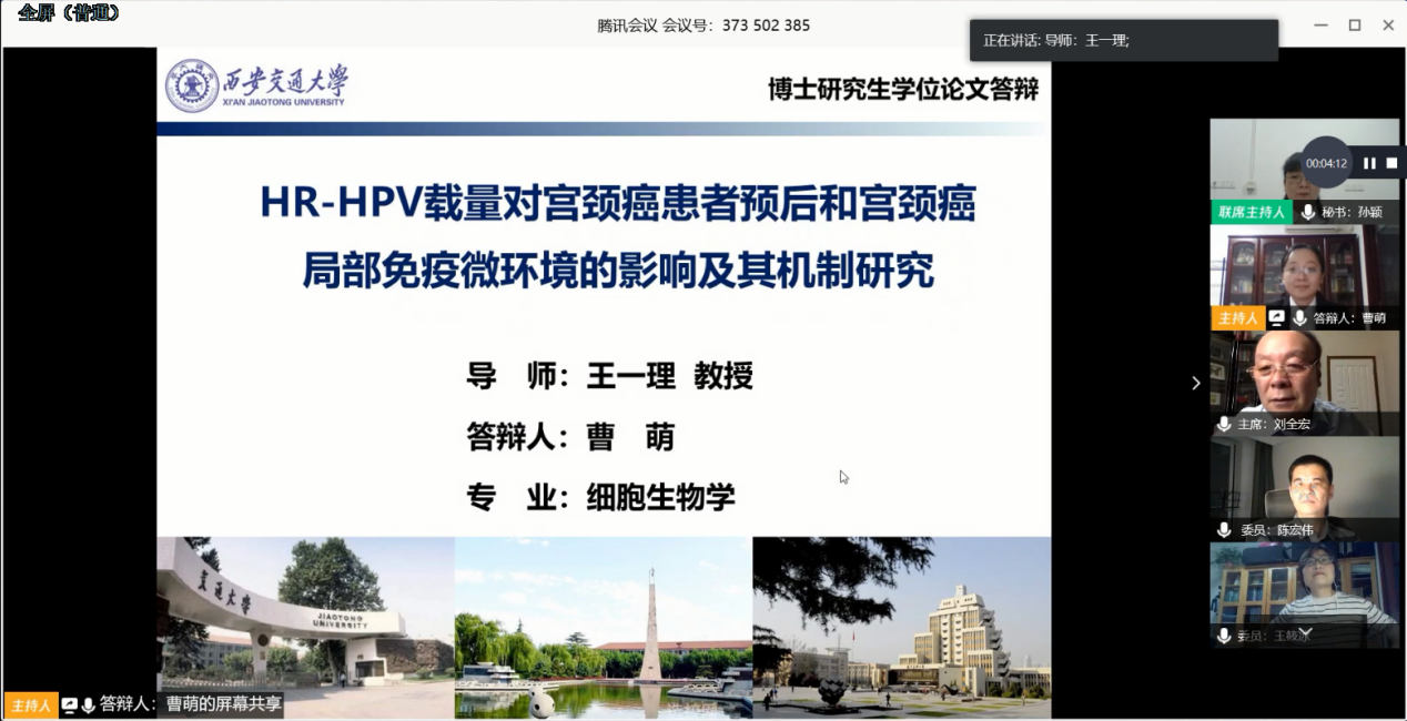 曹萌的博士学位论文答辩题目是《HR-HPV载量对宫颈癌患者预后和宫颈癌局部免疫微环境的影响及其机制研究》,他在陕西省西安市长安区家中,通过腾讯会议网络平台,进行了学位论文PPT共享,与在西安各地的答辩委员会专家进行实时交流。在汇报结束后,答辩委员会专家针对论文内容进行了提问,曹萌同学对各位专家所提的问题进行了准确的回答。专家们还就曹萌同学课题的延伸进行了进一步广泛的讨论。