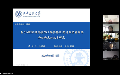 李晨曦的博士学位论文答辩题目是《基于MRI的遗忘型MCI与早期AD患者脑功能网络和结构定征技术研究》,她在家中,通过腾讯会议在线视频、学位论文PPT共享的方式,与在西安的答辩委员会专家进行实时、动态探讨交流。在答辩报告结束后,答辩委员会专家针对论文内容分别提出了相关问题及建议,李晨曦同学对所提问问题进行了准确回答。