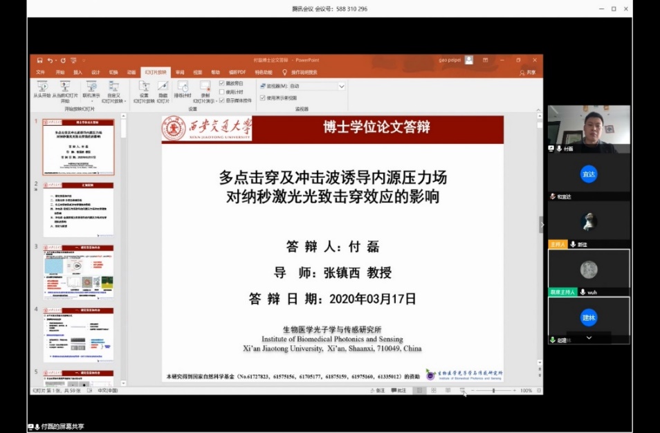 随后,付磊同学进行了论文答辩,其博士学位论文答辩题目是《多点击穿及冲击波诱导内源压力场对纳秒激光光致击穿效应的影响》,他在重庆家中,通过腾讯会议网络平台,进行了学位论文PPT共享,与在西安和福州的评委专家进行实时交流。在汇报结束后,答辩委员会专家针对论文内容进行了提问,付磊同学对各位专家所提的问题进行了准确的回答,专家们还就其课题的延伸进行了进一步广泛的讨论。学校督导专家马建刚教授也全程参与了网络答辩过程。