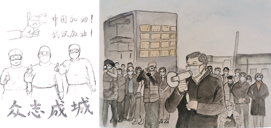 支部党员通过手绘祝福方式进行,尽自己的一份力抗击疫情,向奋战在一线的英雄致敬。支部党员秦梦凡同学的作品以医护人员作为抗疫英雄主体进行创作,很好地诠释了团结一心,共同战“疫”的主题。中华儿女团结一心,各地医护人员在第一时间奔赴武汉,打赢疫情防控人民战争、总体战、阻击战。支部党员郭肖玉同学看到王树国校长泪洒送别逆行战士的视频时,感受到了校长和我们一样牵挂武汉疫情的焦急心情,以及其对逆行者的牵挂不舍,用画笔画出这一幕,希望它能让我们铭记奋斗在疫情前线的人们,用他们舍己为人的献身精神鼓舞自己,自觉居家不外出,为疫情防控贡献自己的一份力量。