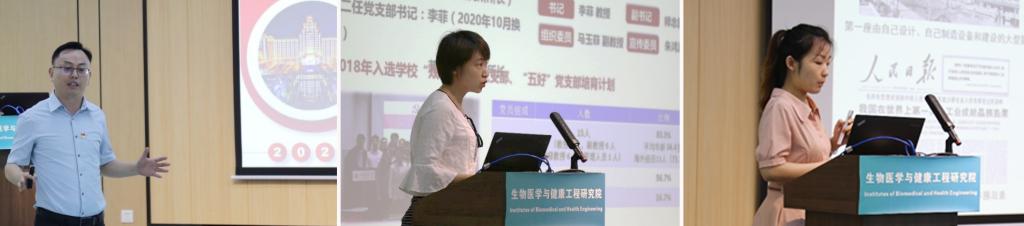 学生党员师念园以《中国科技追求卓越的70多年》为题讲微党课。青年教师党员林敏、黄海水、程波交流学习体会,认为应抓住时代赋予科研人员的良好机遇,利用学科交叉融合的优势,解决生物医学与健康工程领域内的科学问题,成长为国家基础研究和重大科技突破的主力军。