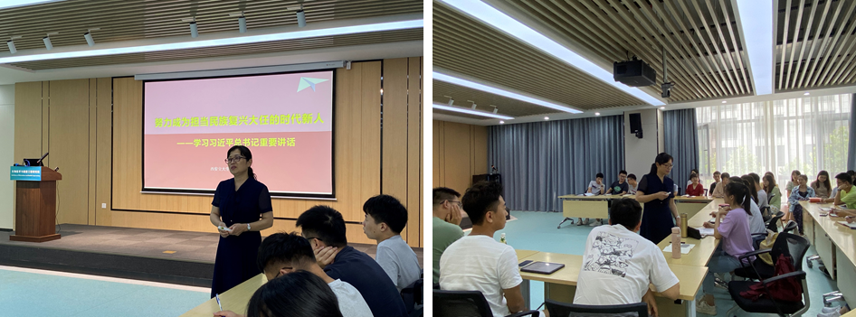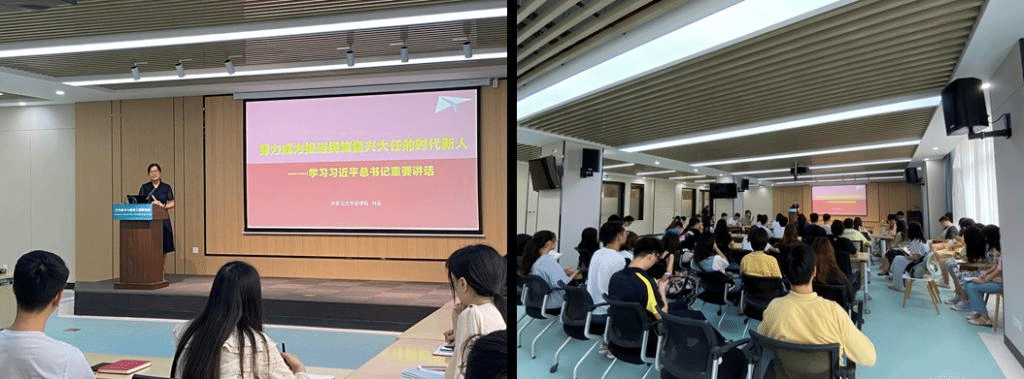 随后,刘茹从立德树人根本任务、胸怀“两个大局”、把握“新发展阶段,贯彻新发展理念,构建新发展格局”三个方面,弘扬中华民族精神谱系以及对学生的“五育”等五个方面分别阐释了习近平总书记的重要讲话。勉励青年党员端正理想信念和价值取向,树立清晰且长期的人生目标,将个人成长融入到国家和民族的发展之中,立大志、明大德、成大才、担大任。