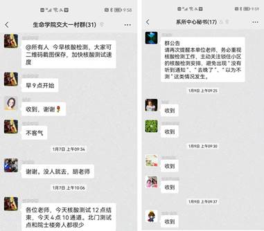 行动是最有力的带动。只有党员首先站出来、敢于冲上去,把群众带动起来、凝聚起来、组织起来,才能紧紧依靠群众坚决打赢疫情防控阻击战。在抗疫关键时刻,师生党员勇担重任,用行动践行誓言。住在兴庆校区家属区的教师党员迅速组成志愿服务队,承担起社区内开元教师的核酸检测、购买物资提醒以及与开元的沟通联络工作。李菲、柳絮云、王斯佳主动承担起了老同志一对一的帮扶,细致、全面的服务和提醒,让教职工频频为他们点赞。马西萍老师负责每日健康信息的报送,每天定时提醒所有教职工按时报送健康信息,将信息通知到位,温馨提醒到位。董艳花、孔令洪等一批教职工在居住社区开展志愿服务,用自己的行动践行交大人的西迁精神。