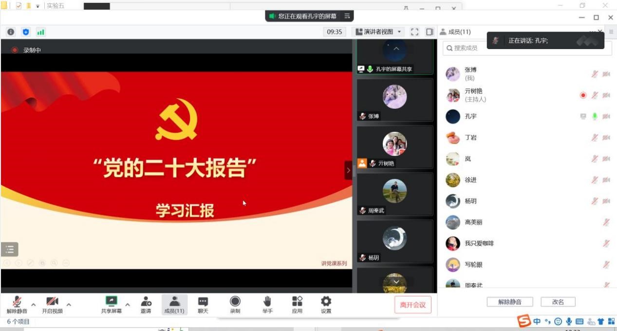 支部书记孔宇做党的二十大报告学习汇报,结合报告主题、具体内容和学习体会做以分享,号召全体党员同志认真研读学习党的二十大报告,特别是第五部分实施科教兴国战略部分内容,围绕加快建设教育强国、科技强国、人才强国,坚持为党育人、为国育才,全面提高人才自主培养质量布局工作。