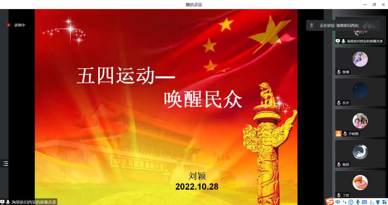 刘颖老师以《五四运动——唤醒民众》为题,从五四爱国运动的背景、五四运动的过程、五四运动的意义及五四精神等几个方面做以分享。五四运动是中国近代史上的一次彻底的不妥协的反帝反封建革命运动,青年学生是先锋,工人阶级是主力军,它是中国新民主主义革命的开始。