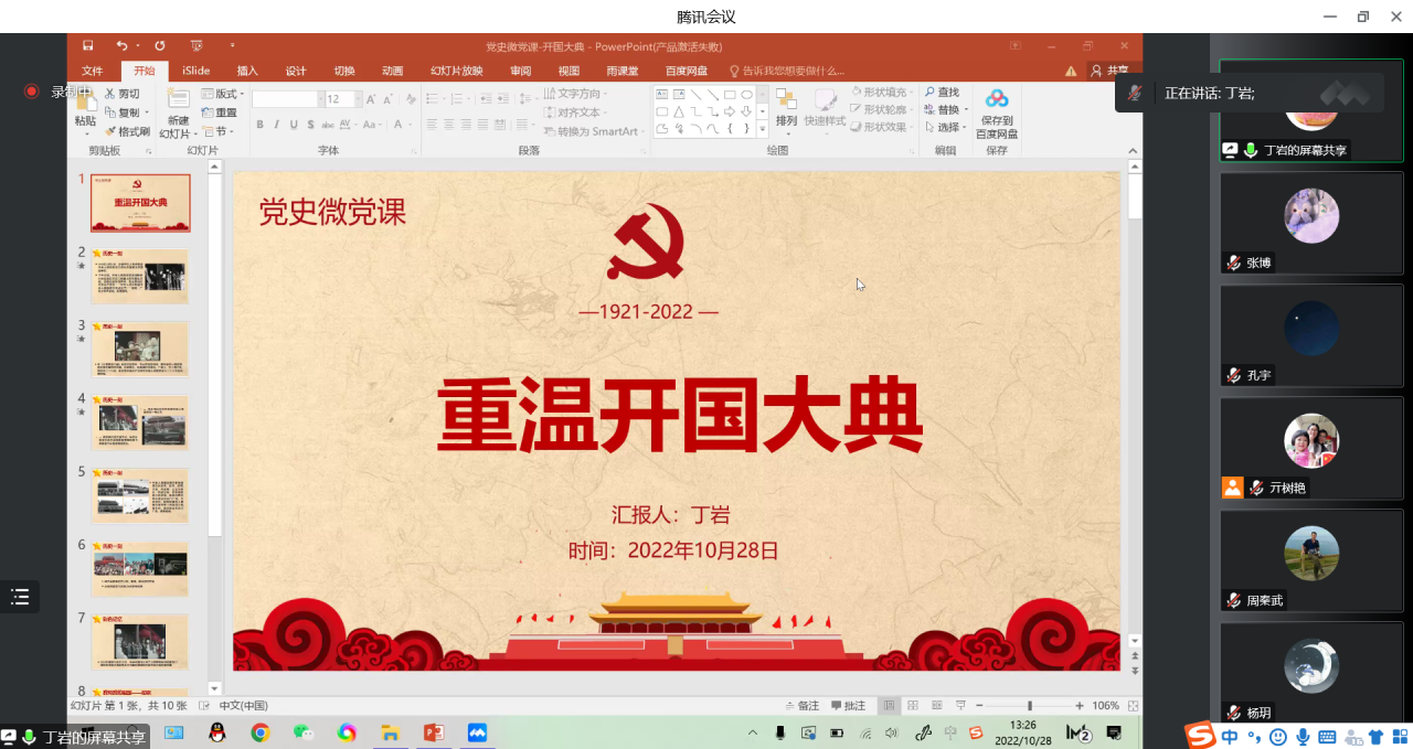 在讲党史环节,丁岩老师以《重温开国大典》为题带全体党员同志重温了开国大典这激动人心的时刻,1949年10月1日下午三时,中央人民政府委员会秘书长林伯渠在天安门城楼上宣布典礼开始。在群众的欢呼声中,毛主席向全世界庄严宣告:“中华人民共和国中央人民政府今天成立了”!时光荏苒,今天在中国共产党的带领下我们取得了新时代的伟大功绩,丁老师结合实施科教兴国战略,强化现代化建设人才支撑,交流了作为一线教师坚持为党育人、为国育才的使命和决心。